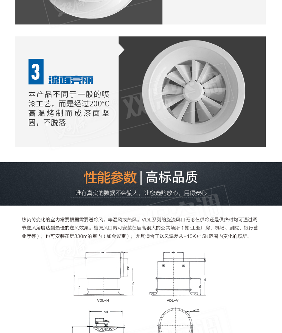 江蘇雙保空調有限公司—旋流風口用于高大空間送風,射程遠。常用于頂送風,可電動或手動調節送風風量。面板為冷軋鍍鋅鋼板,散流圈為深拉沖壓鋁制件,表面為純白色(RAL9010)漆。